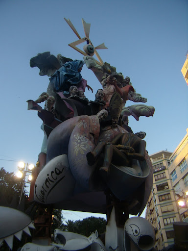 El autor ha realizado en la base de la hoguera una fusión muy imaginativa de tres obras maestras de la pintura: El Guernica de Picasso, El tres de mayo de 1808 en Madrid de Goya y La rendición de Breda de Velázquez.